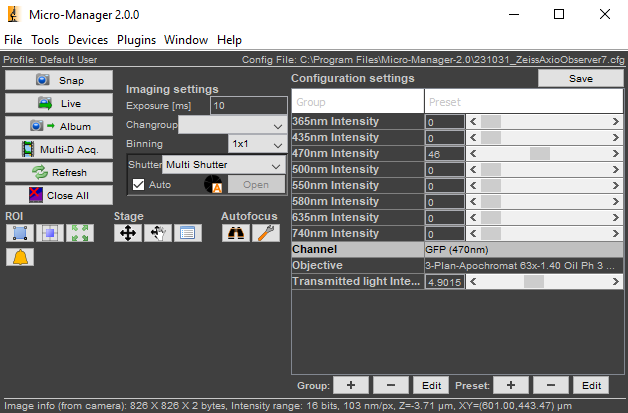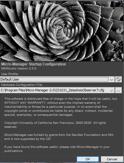 After a few seconds or less You will see the Micro-Manager startup screen. Ensure that the 231031_ZeissAxioObserver7.cfg configuration file is selected. We have placed it inside the Micro-Manager folder in case you must select it yourself.