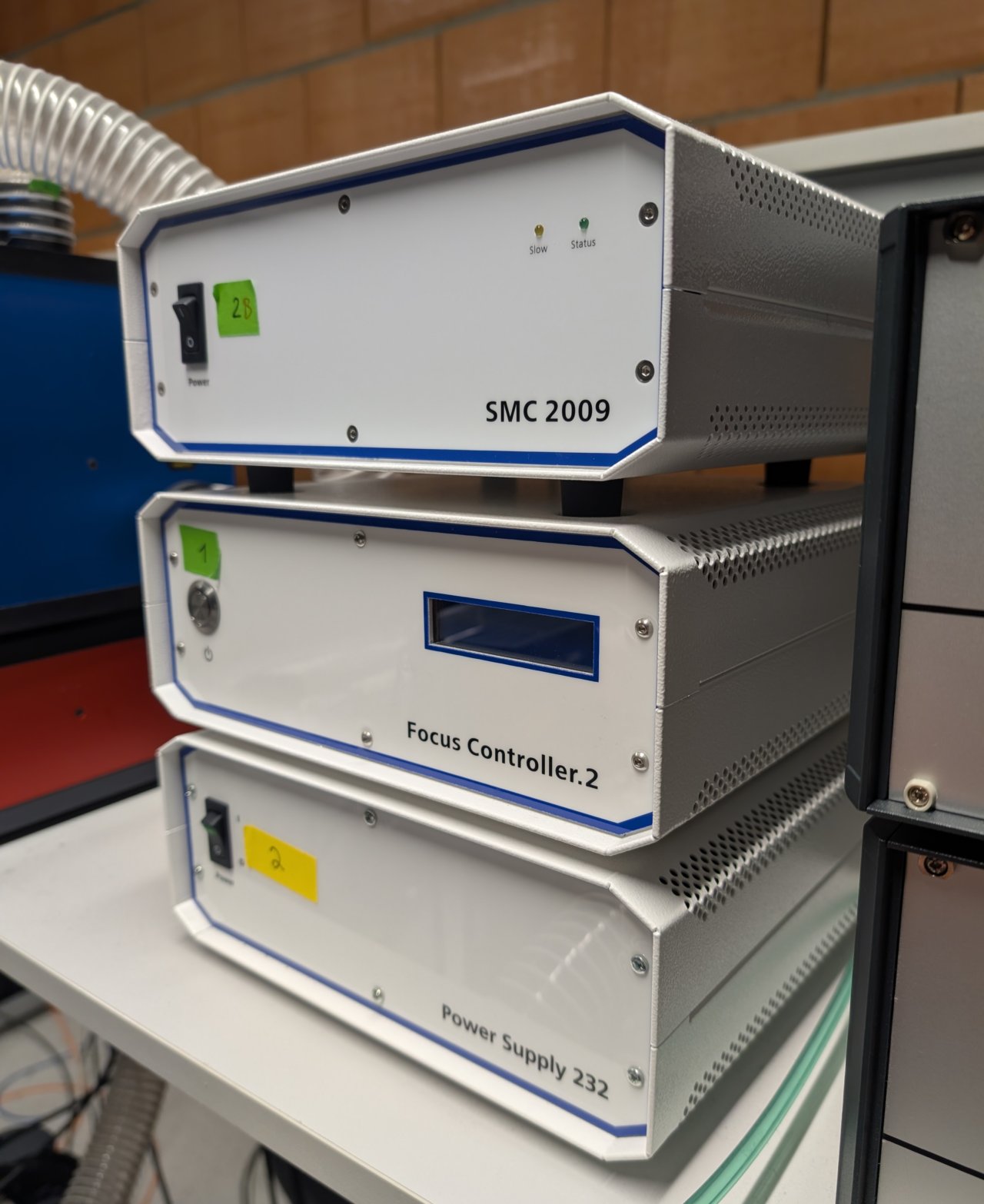 In addition, turn on the Zeiss’s Power Supply 232 and SMC 2009 controllers.