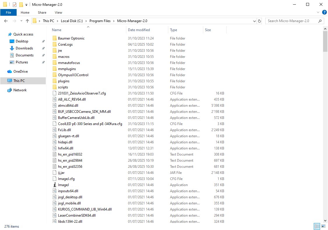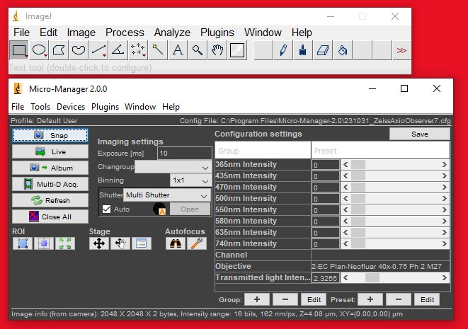 2025-12-05: This shortcut should point to C:\Program Files\Micro-Manager-2.0\ImageJ.exe. It is a slightly out-of-date version of Micro-Manager that is intended to support the CoolLED light source.